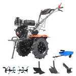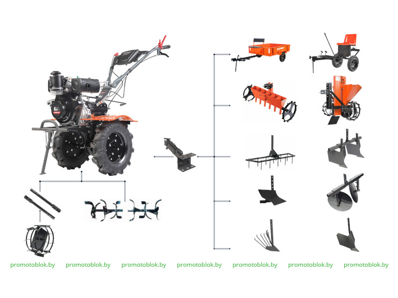 С этим мотоблоком агрегатируется навесное оборудование: прицеп, адаптер ездовой, сеялка,